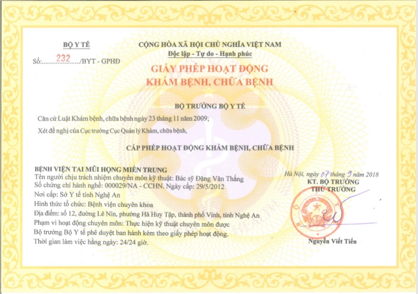 Bệnh viện Tai mũi họng Miền Trung, địa chỉ số 12 Đại Lộ Lê Nin – Thành phố Vinh – tỉnh Nghệ An. Được thành lập theo Giấy phép hoạt động khám chữa bệnh số 232/BYT-GPHĐ ngày 07/09/2018 của Bộ Y tế, chính thức đi vào hoạt động kể từ ngày 10/09/2018. Bệnh viện Tai mũi họng Miền Trung là bệnh viện chuyên khám, điều trị tất cả các bệnh về Tai mũi họng người lớn và trẻ em.